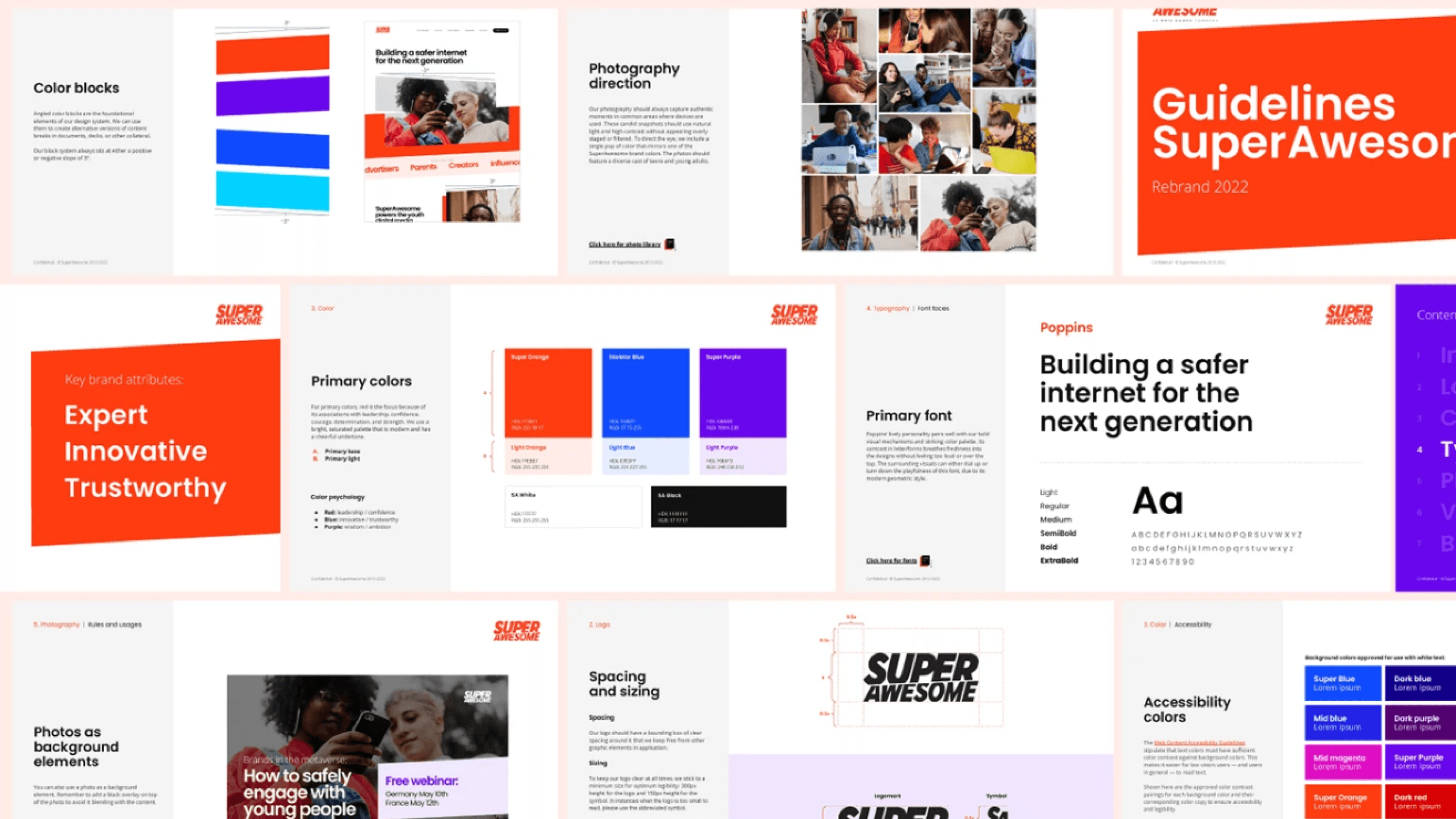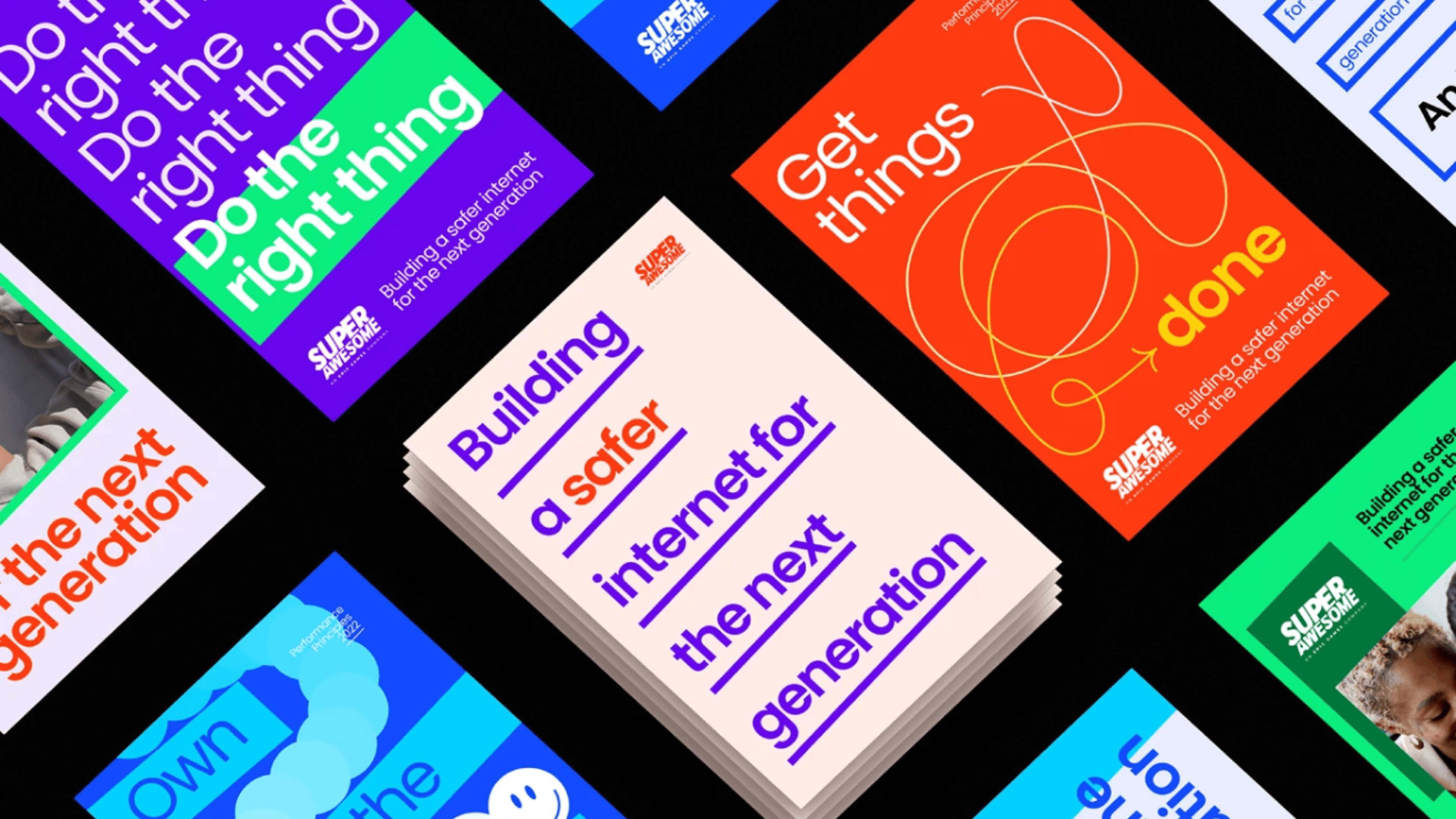 This brand refresh for SuperAwesome (an Epic Games company) "ages up" the platform’s identity to better resonate with a sophisticated B2B audience. Moving away from youthful tropes, the creative strategy adopts a Hero archetype through bold geometric linework, high-contrast color blocking, and a revitalized palette of confident leadership. By pairing sharp, structural design elements with authentic photography, the system balances technical expertise with human warmth—positioning SuperAwesome as the mature, innovative authority in youth digital safety.
